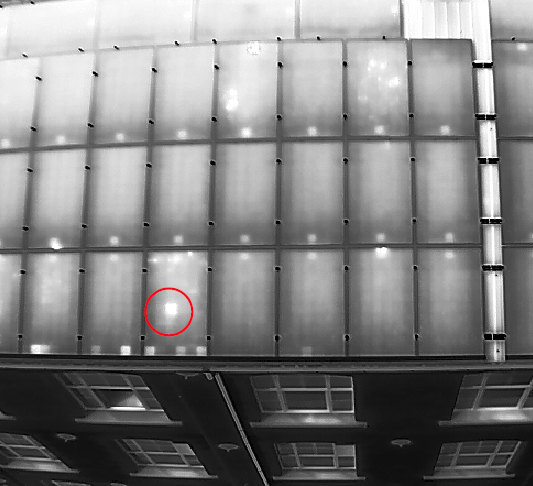 Hier sehen wir die Auswirkungen einer defekten Bypassdiode auf einem Photovoltaik-Modul. Bypassdioden sind dazu da, um einzelne verschattete oder beschädigte Zellen zu überbrücken und so die Effizienz des gesamten Moduls zu erhalten. Wenn eine Bypassdiode ausfällt, kann dies zu einer Überhitzung bestimmter Modulbereiche führen, da der Strom nicht mehr korrekt umgeleitet wird. Auf dem Wärmebild zeigen sich diese überhitzten Bereiche deutlich, was auf eine ungleichmäßige Stromverteilung hinweist. Eine defekte Bypassdiode kann die Leistung der gesamten Anlage beeinträchtigen und langfristig zu weiteren Schäden führen. Ein schneller Austausch der Diode ist daher unerlässlich.